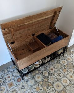 Banc d'entrée industriel avec coffre de rangement en bois massif et métal noir L100 cm SORG