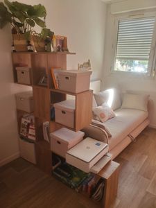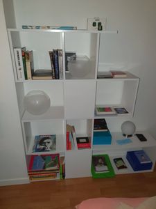 Meuble à monter. Peut se fixer au mur grâce à un jeu de crochets muraux fournis.