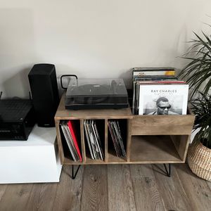 Chacun de vos vinyles trouvera sa place dans notre buffet BOOGIE. Certains pourront être rangés au même niveau que votre platine, pour pouvoir les feuilleter et choisir votre prochain morceau. Et les autres auront la possibilité d'être classés dans les quatre niches sous votre tourne-disque, pour les retrouver plus rapidement. - Caroline Marliac