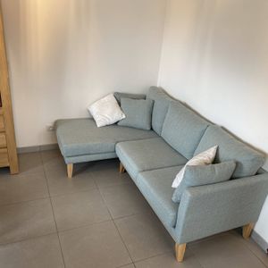 petit canapé d'angle en tissu vert de gris mobilise très peu de place grâce à ses