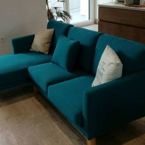 Canapé d'angle gauche déhoussable scandinave en tissu vert de gris et bois clair 3-4 places livré prêt à assembler. Montage simple, seuls les pieds sont à fixer. Les colis étant volumineux, nous vous conseillons de vérifier que portes et escaliers permettent leur passage.