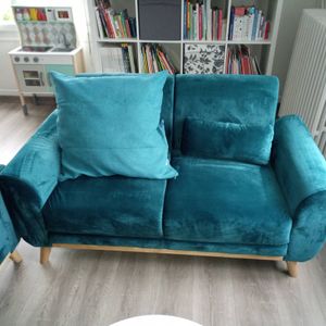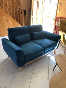 Canapé 2 places en tissu bleu foncé et bois foncé EKTOR