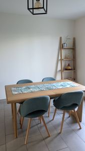 Proposées dans une jolie palette de couleurs, ces chaises en tissu beige se multiplient à l'envi autour de la table à manger.