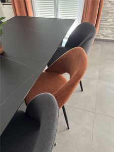 Ces assises au charme subtilement rétro sont synonymes de convivialité et de partage. Leur tissu se décline dans un coloris vert de gris, une teinte chaleureuse et envoûtante. Les pieds fuselés en métal noir apportent de la légèreté à la silhouette et s'accordent aisément avec tous les styles de tables à manger.
