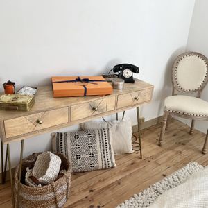 Console avec rangements 3 tiroirs en bois manguier massif gravé et métal doré L120 cm LINIUM