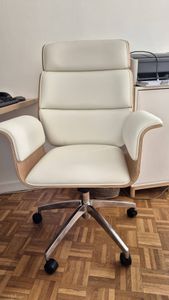 Fauteuil de bureau à roulettes design en tissu gris clair, bois clair et acier chromé ELON