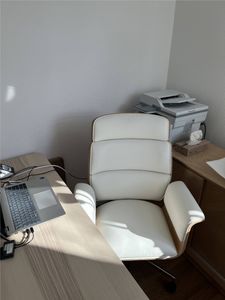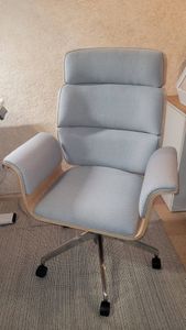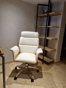 fauteuil de bureau blanc et bois clair réunit confort et style. Pour un espace de travail tendance et fonctionnel, on accompagne ce siège d'un