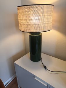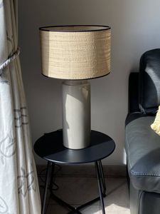 Avec sa grande base cylindrique en céramique émaillée noire et son abat-jour en raphia naturel, cette lampe à poser noire arbore un jeu de matières justement maîtrisé. Elle offre le parfait mélange entre modernité et authenticité ! On aime particulièrement le biais en coton noir qui souligne délicatement l'abat-jour. Avec son look épuré, cette lampe à poser fabriquée au Portugal s'harmonise tout en douceur avec le reste de votre intérieur.