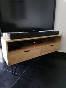 Banc TV livré prêt à monter. Pieds à fixer.