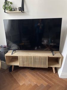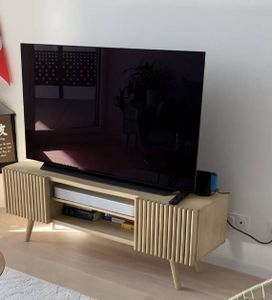 création exclusive est un meuble fonctionnel et adaptable à vos besoins. Elle possède des espaces de rangement fermés et des niches ouvertes. Grâce aux portes coulissantes, à vous de choisir les éléments que vous souhaitez cacher ou découvrir. Des passe-câbles prévus à l'arrière du meuble permettent de brancher facilement lecteur DVD, box internet ou console de jeux.