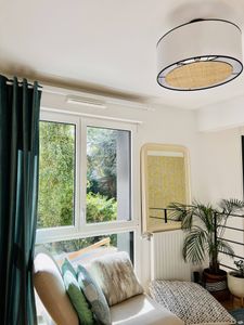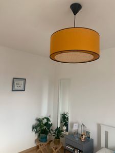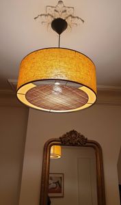 La lumière filtrant à travers la matière, cet abat-jour offre un éclairage d'ambiance chaleureux. Il est complété par un disque diffuseur amovible en rabane naturel. Vous pouvez ainsi choisir l'intensité lumineuse de votre suspension. Sans le disque diffuseur, la lumière sera projetée directement vers le bas et donc relativement puissante. Avec le disque, la lumière sera plus diffuse car indirecte.