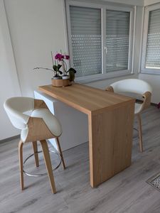 table haute façon îlot MAX est un meuble pratique à l'esthétique soignée. Ses finitions blanc mat et chêne en font une pièce de mobilier moderne et chaleureuse. On l'accompagne de
