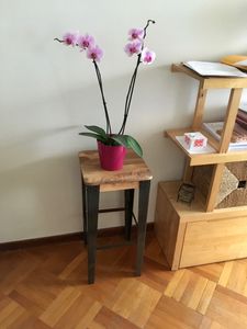 Les angles, renforcés par des cornières rivetées, soutiennent un tabouret en bois de manguier. Le manguier est naturellement teinté dans les tons jaunes à marron et c'est un bois très résistant qui saura durer dans le temps sans vieillir.