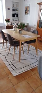 canapé en velours côtelé dans le salon ou en dessous d'une table à manger en bois clair dans l'espace repas, laissez le charme artistique de ce beau